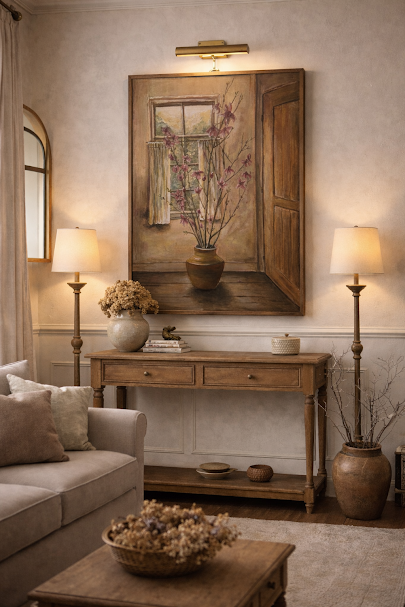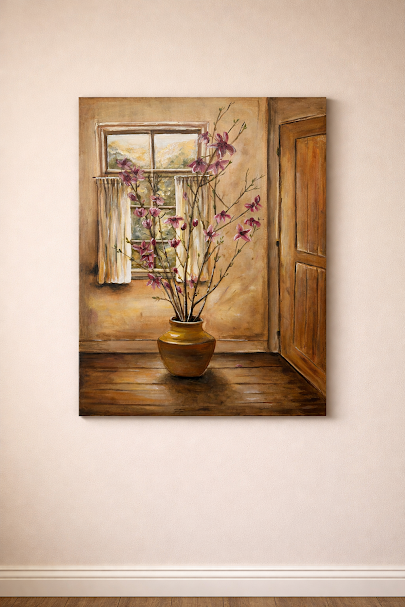 Les tons chauds, la texture du bois et la présence florale créent une atmosphère intime, silencieuse et réconfortante.